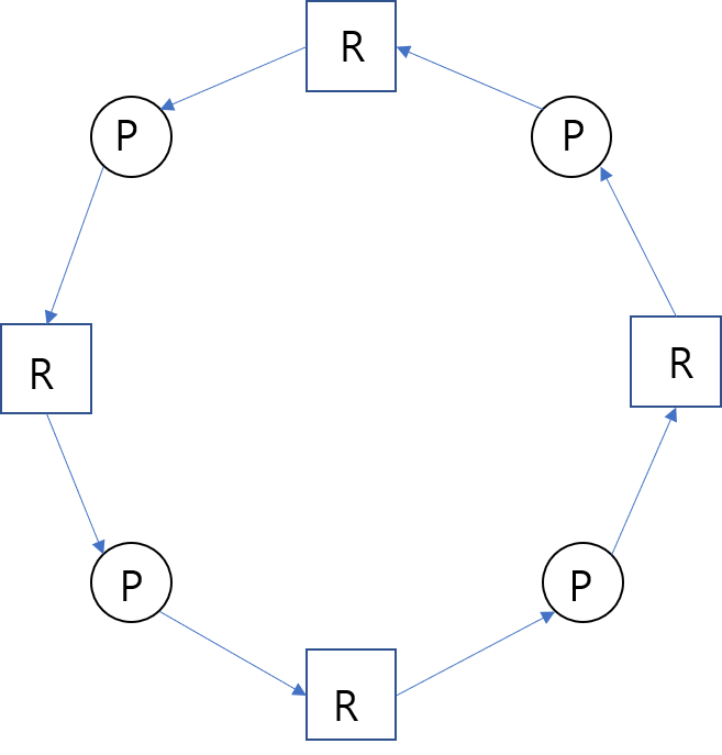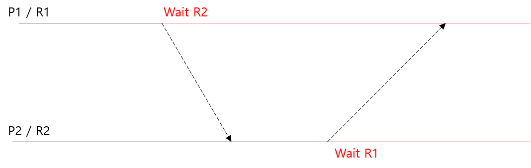 - t0에서 R2를 엑세스하고자 했던 P1은 R2가 반환될 때까지 기다리고, t1에서 R1을 엑세스하고자 했던 P2 역시 P1이 작업을 처리하여 R1을 반납하기를 기다리게 되어, 둘은 무한 기다림에 빠질 것이다.