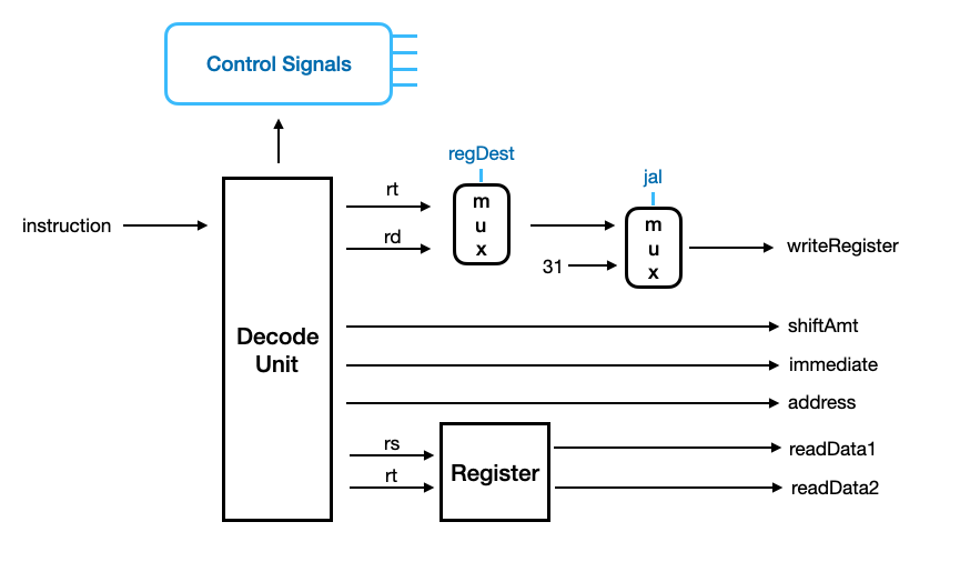 fetch 한 명령어를 해석하고, ControlSignal을 업데이트한다. Opcode에 따라 immediate 값을 가공하고, 레지스터에서 적절한 위치의 값을 읽으며, ControlSignal에 따라 명령어 처리 결과 값을 저장할 레지스터 위치(writeRegister)를 선택한다.