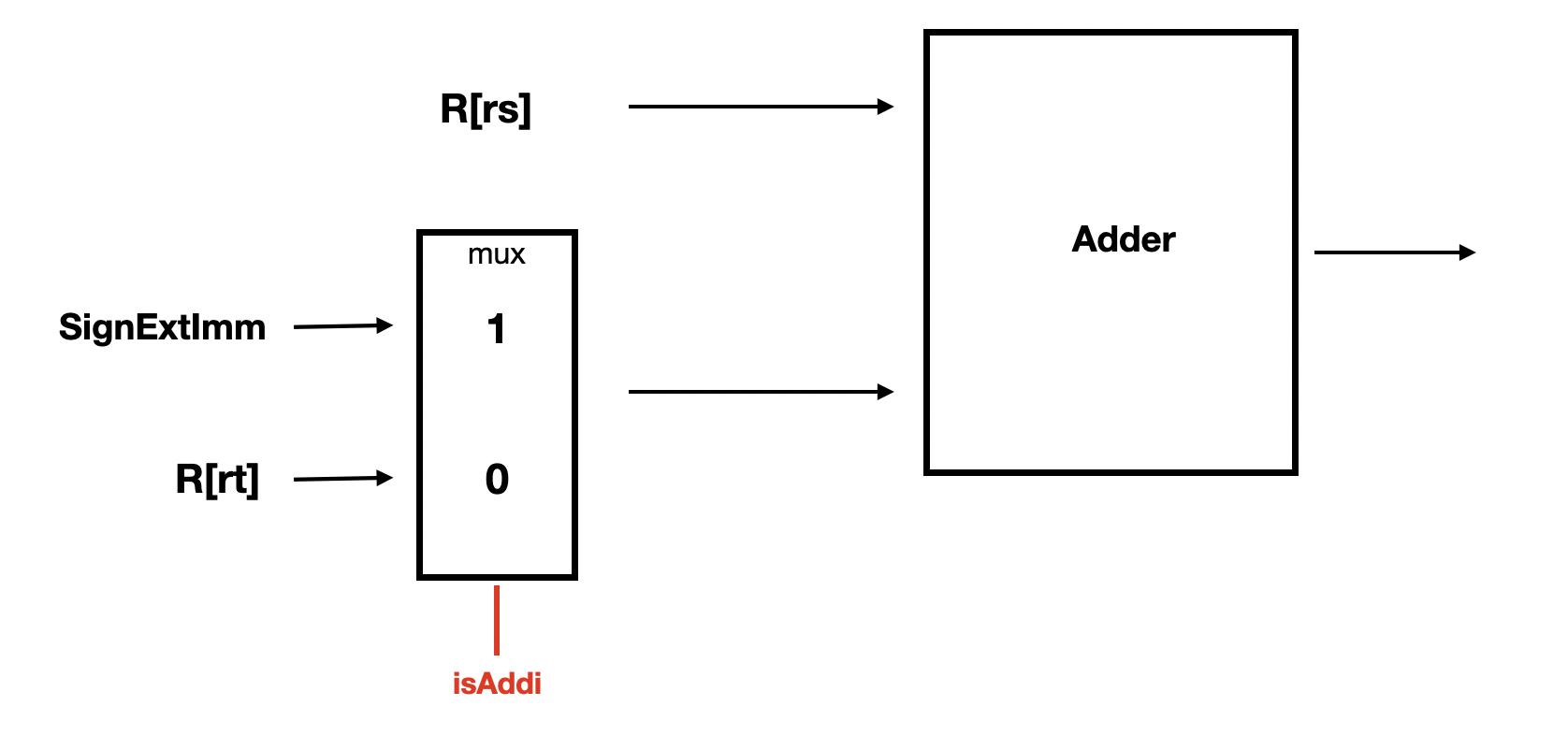 아래 그림의 경우처럼 isAddi, 즉 명령어가 Addi인지 여부를 Control Signal 하고, mux에 신호를 주는 것으로 Adder에 R[rs]와 함께 피연산자가 될 값을 선택할 수 있다.