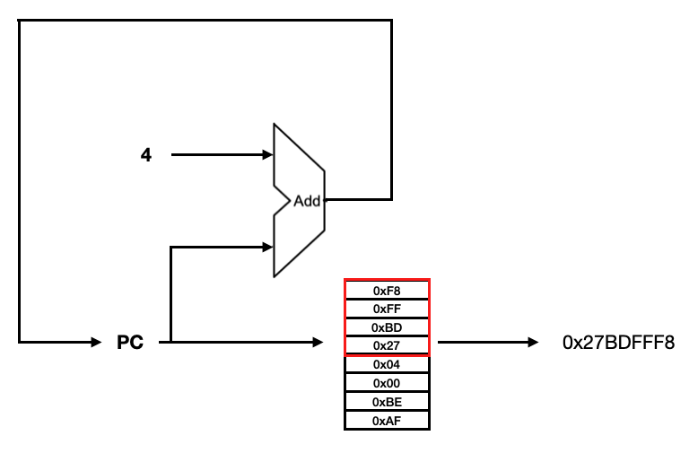 리틀 엔디안 방식으로 데이터를 읽고 썼다. 0x27BDFFF8, 0xAFBE0004 두 명령어가 차례로 저장된다면 메모리에 다음과 같이 저장된다. 명령어가 아닌 정수 데이터를 읽고 쓸 때도 4 바이트로 나눠 값을 저장하고, 4개의 주소에 접근하여 나눠진 값을 합쳐 값을 읽는다.