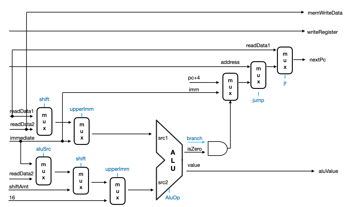 이렇게 해석된 인자를 연산한다. ALU로 처리한 값을 레지스터에 쓰거나, 메모리 접근 시 주소로 사용하게 된다. 또는 연산 결과와 분기 명령 여부를 비교하여 분기 여부를 결정한다. 분기 여부와 controlSignal로 다음 PC값을 결정하여 넘긴다.