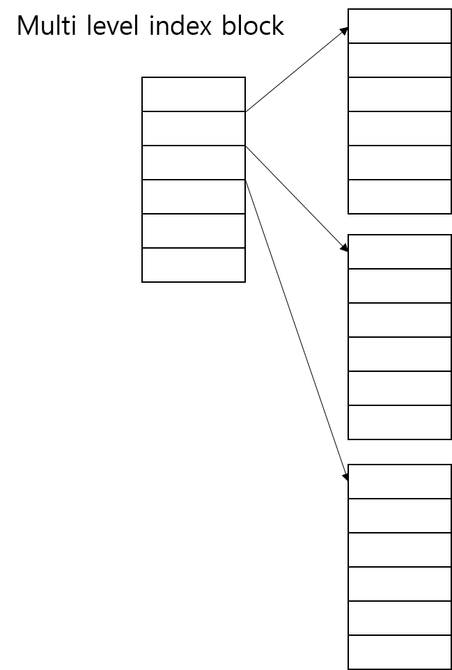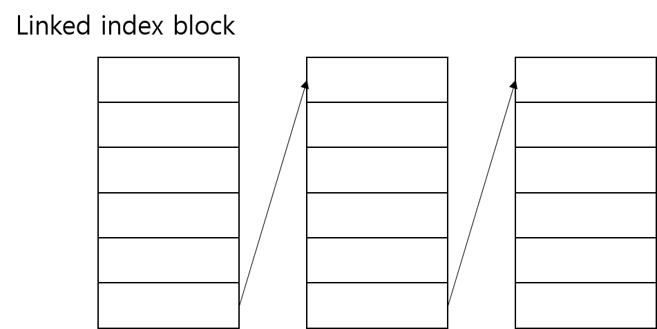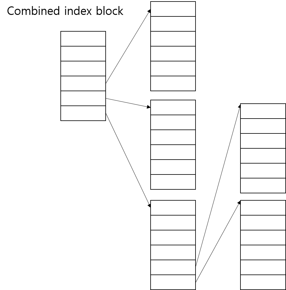- 문제는 블록 사이즈가 작아, 한 블록 안에서 인덱스를 모두 포함하지 못하는 상황이 발생하고, 이를 모두 표시하기 위해서 인덱스 블록을 늘리고, 연결하다보면, 저장소가 낭비된다는 파일 최대 크기 문제가 발생한다. 이런 문제를 해결하기 위해, Linked index block 방식, multi level 방식, combined 방식이 사용된다.