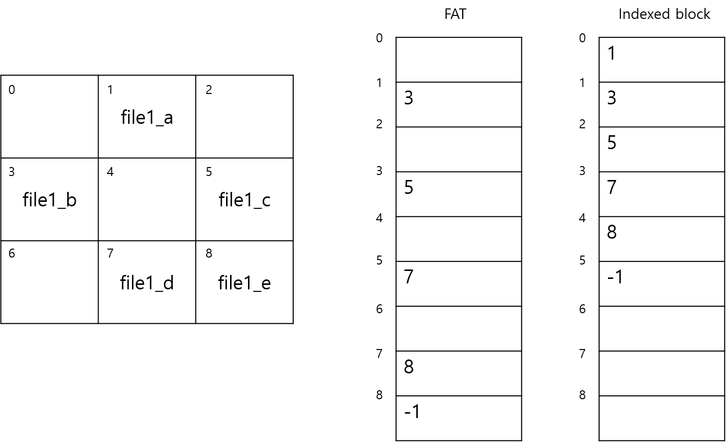 - 8번째 블록을 엑세스 하는데 각 방식별 읽어야하는 블록의 개수