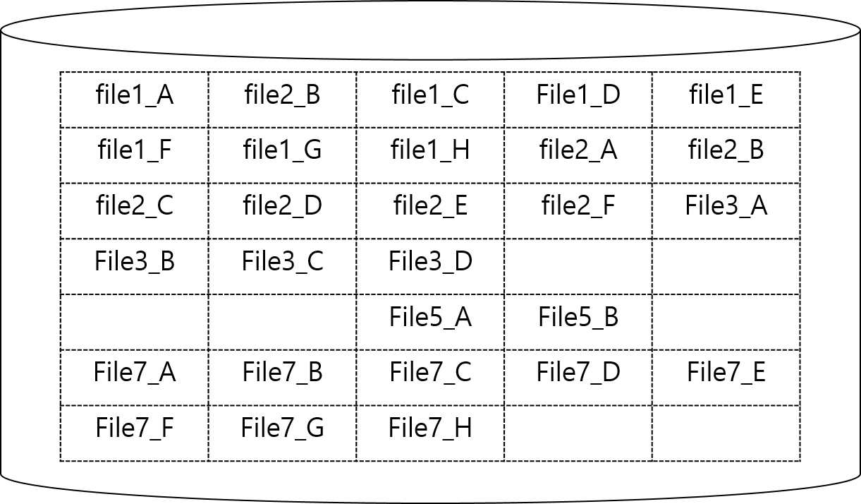 - 문제는 파일을 삭제하고 할당하는 것을 반복하면서, 비어있는 블록이 흩어지게 되고, 이를 모으면 충분한 크기의 저장 공간인데 반해, 연속하지 않아 결국 할당하지 못하는 외부 단편화 문제가 발생한다.
