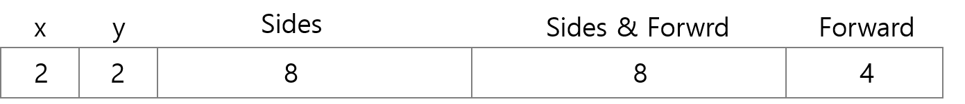 x,y는 16개의 다른 시작 위치를 표현하기 위하여 필요한 2비트 씩을 나타낸다. Sides, Side & Forward, Forward는 각각의 위치에서 장애물이 검출됐을때 회전량을 표현한다.