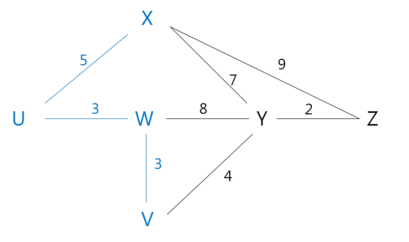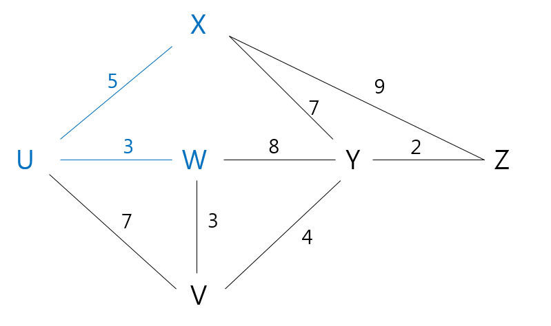 - 위 예시에서 처음 기준 노드를 U라고 했을 때, N 집합은 자신 뿐이다. N 집합에서 이웃된 노드(X, W, V) 중에 최소 비용으로 도달할 수 있는 지점은 W이므로, N 집합에 W를 추가한다.