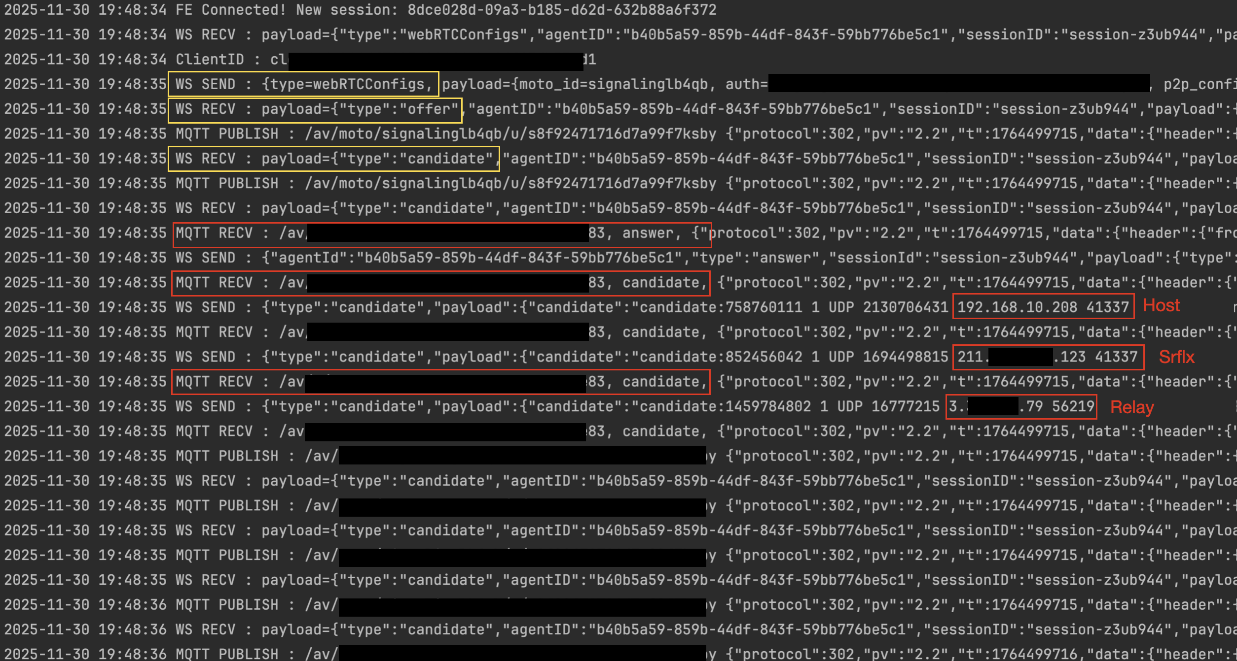 4. [CAM -> FE] ICE Candidate : 기기에서 사용할 수 있는 네트워크 경로 (ICE) 후보 전달