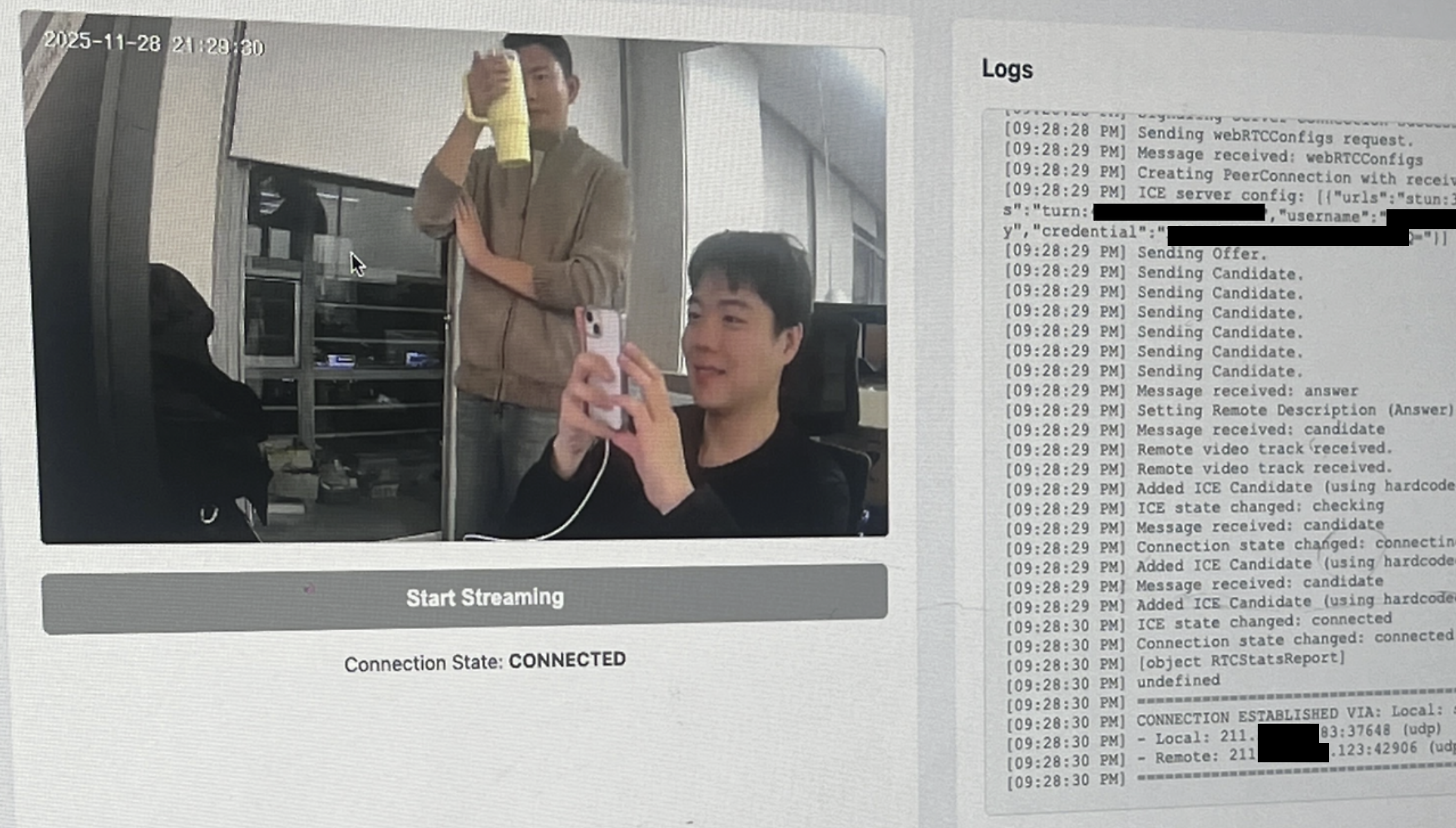 이제 우리는 양 쪽 모두 Stun 서버로 확인한 외부 IP로 NAT 홀 펀칭에 성공했고, P2P 연결이 진행되는 것을 이해할 수 있다.
