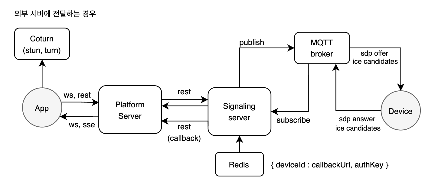 이 경우에선 앱과 플랫폼 측 서버가 통신하고, 시그널링 서버는 플랫폼 측에 SDP Answer와 ICE 후보지들을 전달한다.