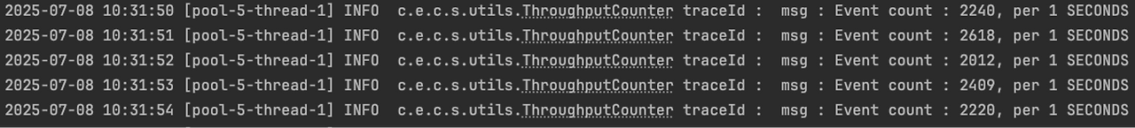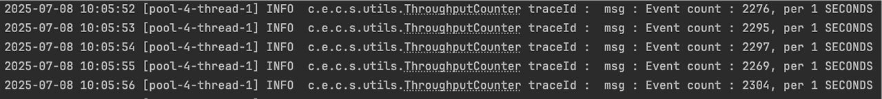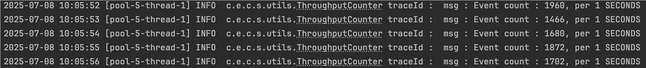 적용 결과는 매우 효과적이었다. 메시지 처리 사이클이 매우 짧아졌고, DB에 데이터 적재에도 지연이 없었다. MongoDB 쪽의 매트릭도 이상 없었다. 아래는 개선 전후의 처리량을 확인하기 위한 로그이다. 명확한 계산을 위해 테스트를 위한 컨슈머 스레드는 단일로 구성했다.