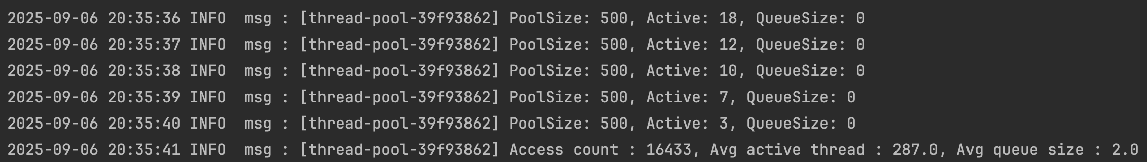 위는 5분 동안 70개의 가상 사용자가 문제 Api에 동시 요청을 진행한 결과이다. 1초에 한번 스레드 풀의 활성 스레드 개수와 큐 개수를 집계하고 이를 출력했다. 5분을 마치고는 그 기간 동안 처리한 요청 수와 평균값을 출력한다.
