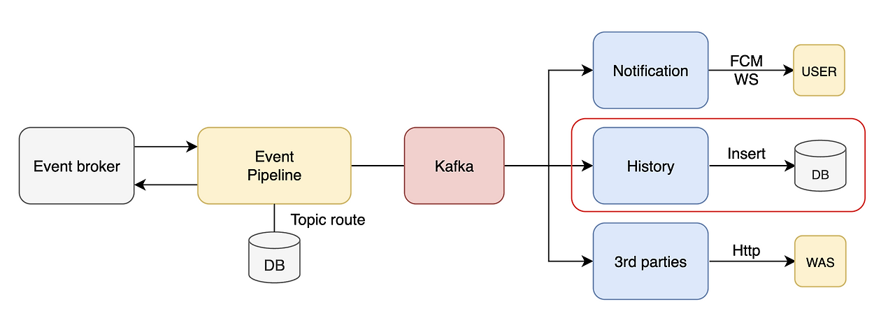 이벤트 파이프라인에서 전달되는 이벤트는 여러 BE 서비스에서 본인의 역할에 맞게 처리된다. 그중 History 서비스는 기기의 상태 이벤트를 저장하거나, 그 내역을 조회할 수 있도록 한다. DB는 MongoDB를 사용하고 있고, 글을 쓰는 시점에서, 해당 서비스로 초당 2500개의 메시지가 전달되고 있다.