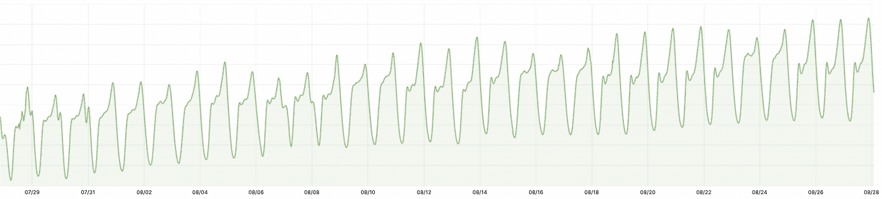 회사가 성장하며 기기 이벤트가 크게 늘었다. 8개월 전까지만 해도 초당 1500건이었던 기기 이벤트가, 이제는 3500건을 넘는다. 한 달 동안의 이벤트 수 변화량만 보더라도, 그 수위가 점점 높아지는 것을 볼 수 있다. 기존 인프라와 로직으로는 늘어난 유입량을 못 따라가고, 곧 지연과 유실로 이어진다.