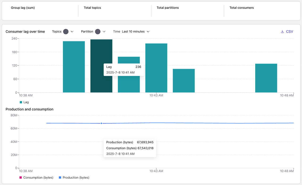 해당 시점의 카프카 대시보드에도 특이사항은 없다. Lag에 쌓이는, 즉 지연이 발생한 경우는 없었고, 이벤트 유입과 수신 속도가 일치했다. 논-블록킹으로 전환 전에는 여러 파티션으로 처리하던 메시지량을, 전환 후에는 단일 파티션만으로 커버할 수 있었다.